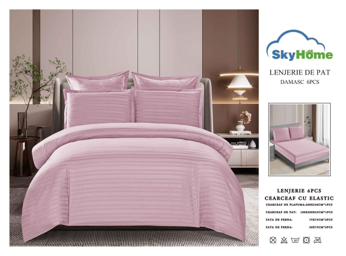 Lenjeria este confectionata din bumbac damasc satinat  cu o textura fina, moale si foarte placuta la atingere.
