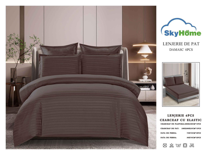 Lenjeria este confectionata din bumbac damasc satinat  cu o textura fina, moale si foarte placuta la atingere.